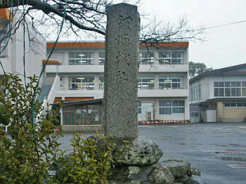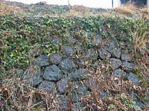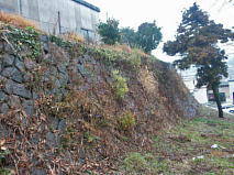 小学校の教頭先生の話によれば、小学校西側の斜面に僅かに石垣が残っているとのことであったが、草に埋もれて確認できなかった。むしろ、給食調理場の周囲に築かれた石垣の方がお城の風情はある。(もっともこの石垣は後世のものだが) |