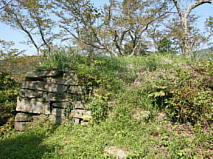 猫尾城は、城山頂部に本丸を置き西側に馬場と二の丸を配置し、麓の中学校辺りに根小屋を設けた縄張りとなっている。本丸は、石垣で周囲を固め、北端と南端は櫓台があり、西側に開かれた虎口には算木積みの石垣が築かれている。 二の丸は、馬場(現在は駐車場と休憩所)の西側、薬師如来堂がある。この曲輪に土塁が残っている。三の丸は、本丸東側の大堀切を隔てた一帯で、ここにも土塁が良く残っていた。 |