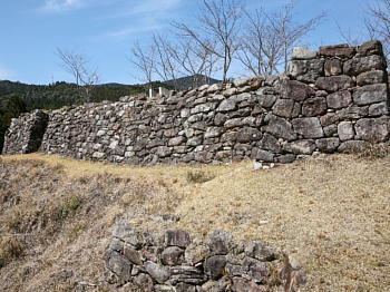 城の規模としては小さい城だが、高さ約3m程の野面積みの石垣、特に本丸の南側と北側に横矢掛の構造が見られ、中世城郭から近世城郭への過渡期の遺構として全国でも貴重な城の一つのようだ。 城の縄張りは、山頂にほぼ四角形の本丸を置き、本丸南には枡形の虎口が設けられている。 二の丸は、本丸東南下に城門があった曲輪で、この曲輪も周囲を石垣で固められいる。本丸南の尾根筋に三方に石垣が積まれた曲輪があり、下段の曲輪には周囲に石垣で固めた井戸があった。 赤木城は、発掘調査がなされ石垣も積み直されたと思われるが、周囲の木立も切り払われ、ともかく綺麗に整備されていた。 |