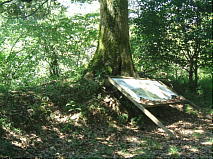 夏場は、登城道も夏草に覆われ、本丸まで登るのに一苦労させられたが、登り初めてすぐに堀切と堅堀があり、夏草の鬱陶しさを忘れさせてくれる。また、本丸には、朽ちて横たわった案内板が無惨な姿であったが、低いが周囲を土塁が廻らされていた。 |