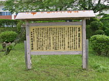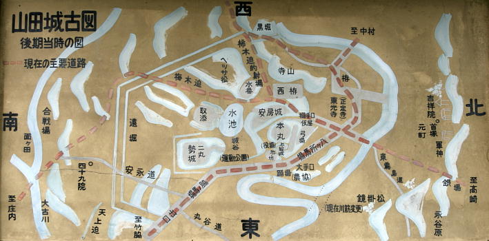 山田城は、本丸(役場)と二の丸(運動公園)と二つの曲輪からなる縄張りとなっている。城の遺構は、二の丸のグランド南側の竹藪の中に長さ15m程の空堀が残っている。確認出来なかったが、教育委員会の説明によると、道路を挟んだ竹藪の中にも旧道に沿うように空堀が残っているとのことだ。 |