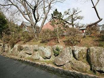 現在は、民家敷地となっていて、敷地内への立入は当然できないが、西側から北側の道路に沿って、一部築地のように手が加えられているが、土塁が今も良く残っていた。 |