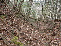 猪倉城の縄張りは、城山北端に位置する山頂部に主郭を置き、弧状に南から東へと伸びる尾根筋に梯郭式に4つの曲輪が並んでいる。 主郭の南側には虎口が開かれ、ここには土塁が残ってる。更に4つの曲輪を繋ぐように南側には土塁が連なる。更に主郭の虎口西側付近から4つの曲輪先端部のある竪堀に至るまで切岸下には横堀と土塁が巡らされている。規模自体は小ぶりな城だが、見どころ満載の城だった。 |