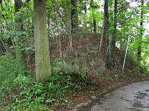 現地案内板によると、かつては本丸・二の丸・三の丸を取り囲むように三重の空堀があったとか。本丸西側は、土塁と空堀跡が残存しているが、整備状態は悪くてブッシュに覆われていた。 |