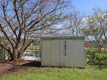 | 平山城は、紀泉国境の三石山から派生する丘陵の先端部を利用して築かれていた。現在は、宅地開発により消滅してしまった。何か城の名残が残っているかと思ったが、バス停と団地内の公民館に「平山城」の名称が付けられているだけ。 |