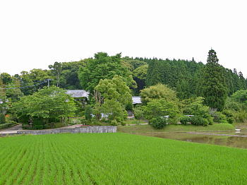 木脇城の所在地を探すのに一苦労。資料にあった写真と興聖寺を頼り木脇地区を探索、木脇小学校の近くにある興聖寺を見つけた。(しかし、登城口は見つからず) 興聖寺の背後にある小高い丘が木脇城だ。この地は、本庄川の支流が西から東へと彎曲して流れ、北側は谷になった要害の地形だったとか。現在では水田と住宅地が周囲にあるのどかな風景がそこにあった。 |