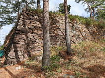 一方、西側には三の丸を置き搦手筋を押さえ、更に一段低い南側に出丸がある縄張りだ。三の丸と南出丸と虎口は石垣で固められ、西の尾根筋に対する遮断線は1条の堀切しかなく、搦手を固めるための高石垣であり、随所に矢が掛かる縄張りとなったのだろう。