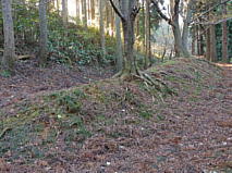 松根城は、富山県との県境となっている砺波丘陵の尾根筋に築かれ、城のすぐ下を「小原道」と呼ばれる旧道が通っていて、加賀と越中とを結ぶ街道を押さえるために築かれた城だ。 松根城の縄張りは、遺構を見る限りでは、尾根筋最高所に本の丸を置き、北側に2段の曲輪、南側に3段の曲輪を配置した縄張りだ。本丸南下の曲輪は、東西とも切岸下に横堀と思われる空堀が構築されていた。南側の街道に向けて虎口が開かれ、虎口付近の遺構も良好で、いたるところに低いが土塁も残っている。 |