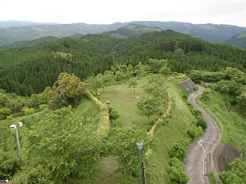 三股城の縄張りは、自然の地形を有効に利用して曲輪が配置された典型的な山城だ。発掘調査に基づいて曲輪が修復整備されていて、模擬天守から見ると、この城の縄張りが手に取るようにわかる。 |
