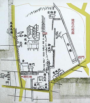 小学校の正門内に小松帯刀の小さな像と南谷城の案内板が設置されている。また、小学校の正門前一帯の通りに面して、かつての小松家家臣団の武家屋敷があり、今も武家屋敷門が残る光景は江戸時代の麓の光景を彷彿させてくれる。 |