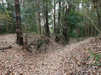 この明智越えと眼下に流れる桂川の両方を押さえるために築かれたのが保津城だ。保津城は、分類上は城郭類似遺構とされ、縄張りを見ても古道に沿って峰堂辺りまで曲輪と思える削平地が尾根上に点在する。「保津城」の標識付近には堀と土塁状の遺構を見ることができた。 |
