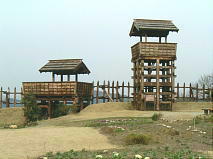 東条城の縄張は、丘陵先端部の最高所に本丸を置き、一段下がって八幡神社境内となっている二の丸、更にその南側に本丸に次ぐ広さがある三の丸を配している。本丸は約50m四方の方形をしていて中世豪族の居館形式を思わせる形式となっている。 現在は古城公園として整備されている。以前に訪れた際には本丸虎口に城門とその脇に井楼形式の物見櫓が復元され中世城郭の雰囲気を味わえたが、久しぶり訪れたら、復元された建物は老朽化のためなのか撤去されていたのは残念。(東条城を紹介する書籍には櫓門や井楼櫓の写真が良く掲載されているが・・・) 城の遺構は、復元された本丸西側の土塁や食い違いの虎口以外に、本丸東側の物見台近くに僅かであるが土塁が残り、二の丸の八幡神社境内を囲むように土塁があった。 |