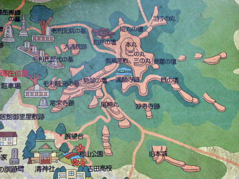 郡山城は、郡山山頂に本丸(2段に分かれている)・二の丸・三の丸が置かれ、これらの曲輪は石垣造りであった。この主郭部を中心にして、放線状に支尾根の曲輪群が築かれている。中でも尾崎丸には毛利隆元の居館があり、背後に空堀を設けた縄張りになっている。 郡山の東南下の支尾根に2筋の堀切で背後の防備とした旧本城がある。連郭式の縄張りで曲輪群が配置されている。支尾根は深い谷に挟まれた半島状の地形をしていて、国人毛利氏の身代に見合った城の規模であるが、なかなか堅固な構えとなっている。 郡山城西南麓に「県立少年自然の家」が建つが、ここが元就の居館「御里屋敷」跡で、ここから登れば毛利隆元の墓所、そして更に「百万一心」の碑がある毛利元就、毛利一族の墓所へと至る。郡山城、ともかくじっくりと時間を掛けて散策したい城の一つだ。 |